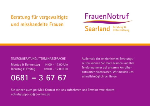 0681 – 3 67 67 schnellstmöglich bei ihnen. www.frauennotruf-saarland.de