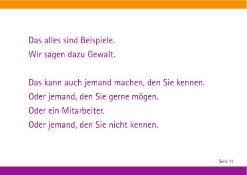 Das alles sind Beispiele. Wir sagen dazu Gewalt. Das kann auch jemand machen, den Sie kennen. Oder jemand, den Sie gerne mögen. Oder ein Mitarbeiter. Oder jemand, den Sie nicht kennen. Seite 11