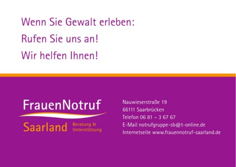 Wenn Sie Gewalt erleben: Rufen Sie uns an! Wir helfen Ihnen! Nauwieserstraße 19 66111 Saarbrücken Telefon 06 81 – 3 67 67 E-Mail notrufgruppe-sb@t-online.de Internetseite www.frauennotruf-saarland.de Seite 16
