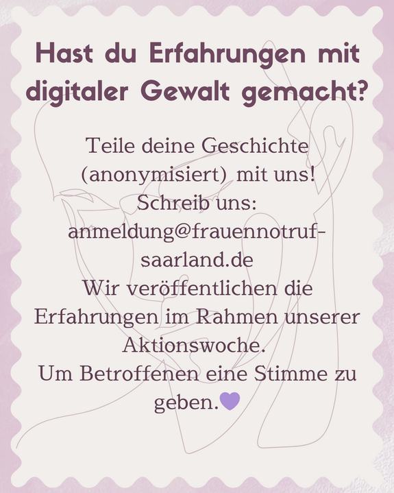 Wenn Sie selbst oder Personen aus Ihrem Umfeld (z. B. aus der Beratung) Erfahrungen mit digitaler Gewalt oder Stalking teilen möchten, senden Sie uns diese gerne per E-Mail an anmeldung@frauennotruf-saarland.de